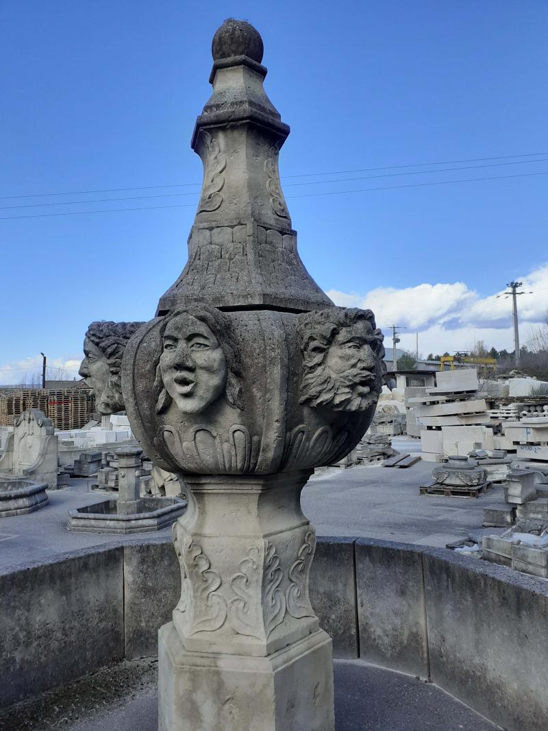 Fontaine réalisée en Pierre du Luberon, c'est une fontaine centrale avec des têtes sulptées dans la pierre.